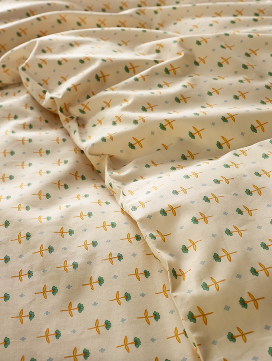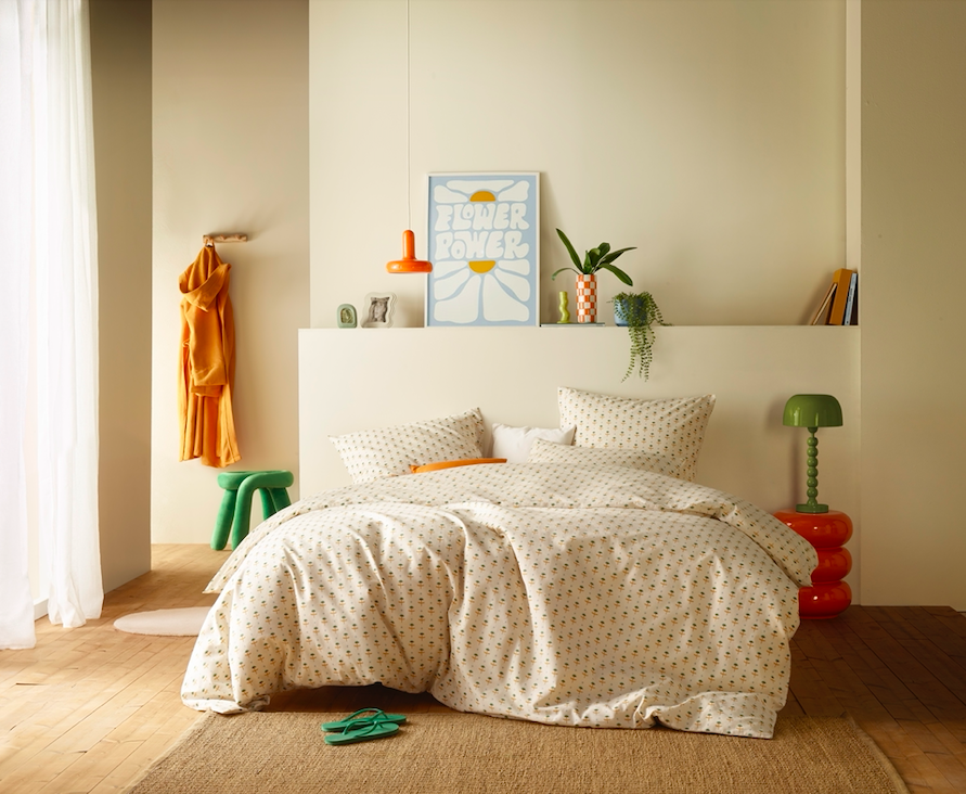 Odil Marigold maakt deel uit van de zomercollectie 2026 van MOOD!T en past binnen een bredere trend waarin natuurlijke kleuren en organische patronen opnieuw hun weg vinden naar het interieur. In plaats van uitgesproken grafische statements kiest MOOD!T hier voor subtiliteit en balans: het dessin geeft karakter aan de slaapkamer, maar behoudt voldoende rust om zich moeiteloos te laten combineren.